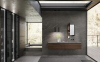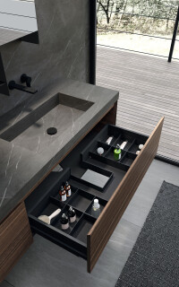 Wooden essences represent matter by excellence, giving warmth, strength and atmosphere to the bathroom area, mainly used for the door and drawer fronts, they are extremely enriching as back panels of open elements, and carefully mixed with Gres and lacquered finishes they contribute to create extremely refined furnishing projects.