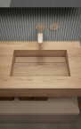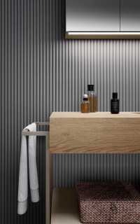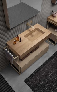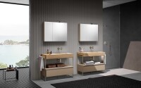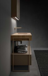 Le essenze legnose rappresentano la matericità per eccellenza conferendo calore, forza e atmosfera alla zona bagno. La loro applicazione è principalmente dedicata ai frontali di ante e cassetti, ma risultano fortemente decorativi anche come schienali per elementi a giorno. Accuratamente mixati con i Gres e i laccati, concorrono a creare progetti d’arredo estremamente raffinati.