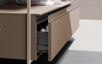La coppia di basi indipendenti, ma speculari, suggeriscono la necessità di condividere l’intimità di uno spazio rispettando quello personale. La maniglia LOFTY in Laccato Terra opaco come il frontale personalizza le basi, sostenute dalla struttura ATLAS in alluminio.